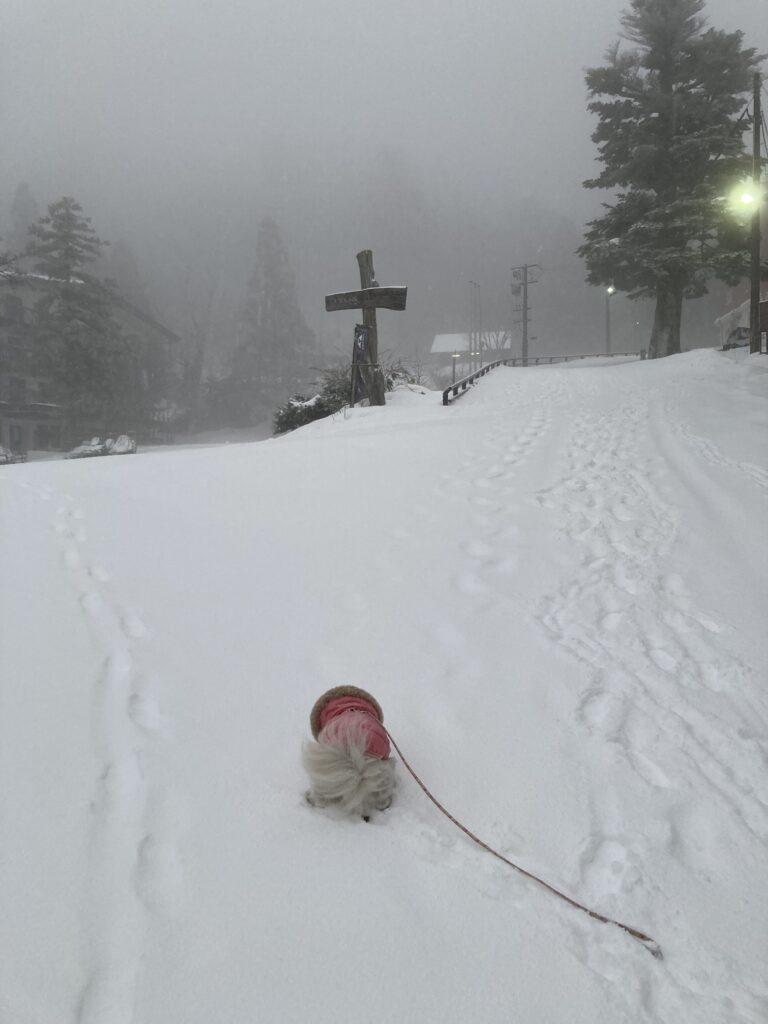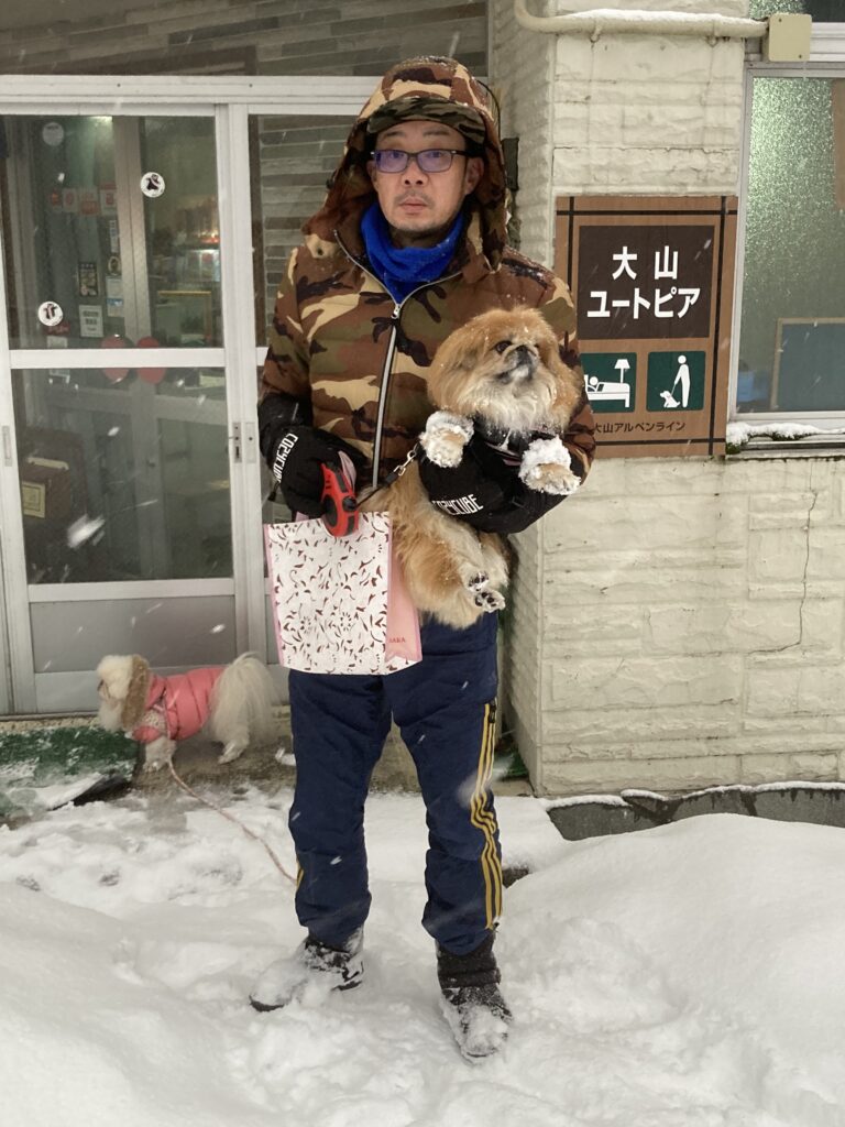 大雪の中、モモとマリアと散歩も楽しんだし、帰る間際まで温泉にも入れたり、ユートピアのご夫妻が動物好きでワンコ達のお世話もして下さってたので、安心して滑ることができました。